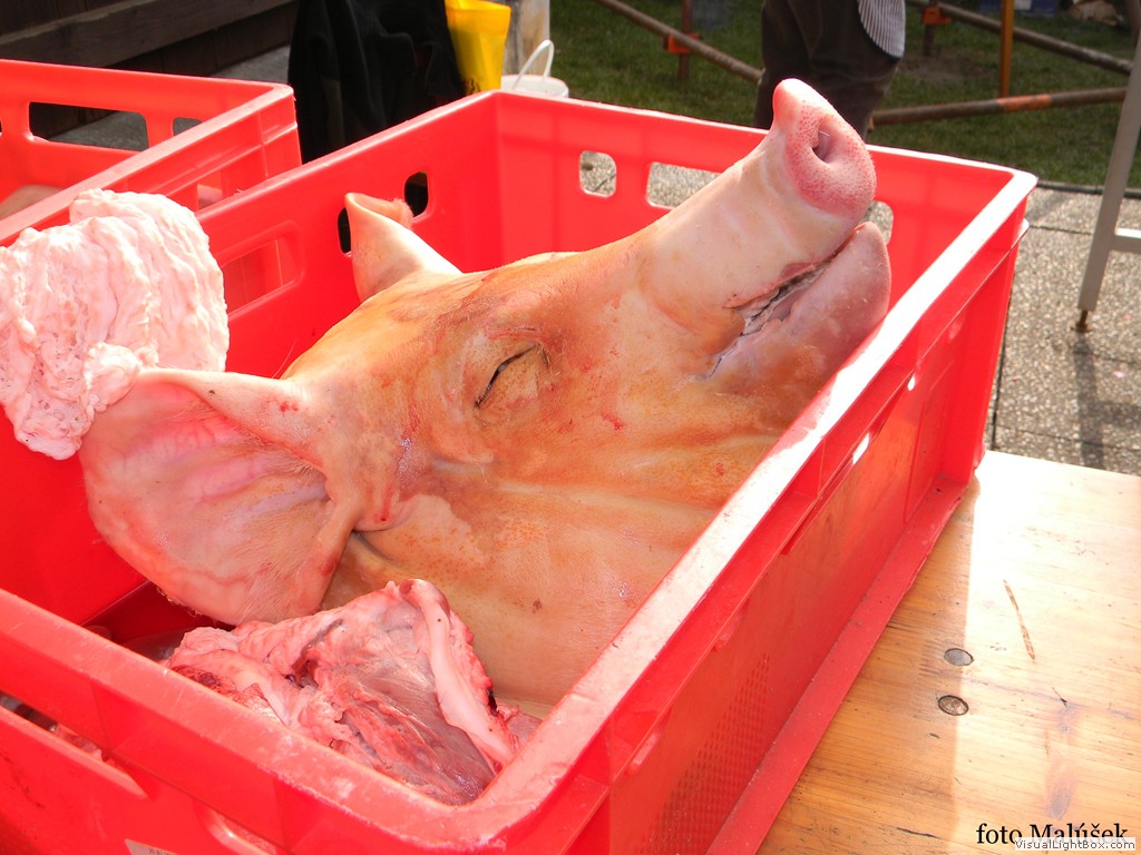 Pro ukázku zpracování vepřového, bylo připraveno vše potřebné a řezníci pan Vojtěch Janoš a pan Vojtěch Bača se pustili do práce, která jim šla velmi dobře od ruky a průběžně jsme vám tak mohli nabízet jednotlivé zabijačkové produkty.