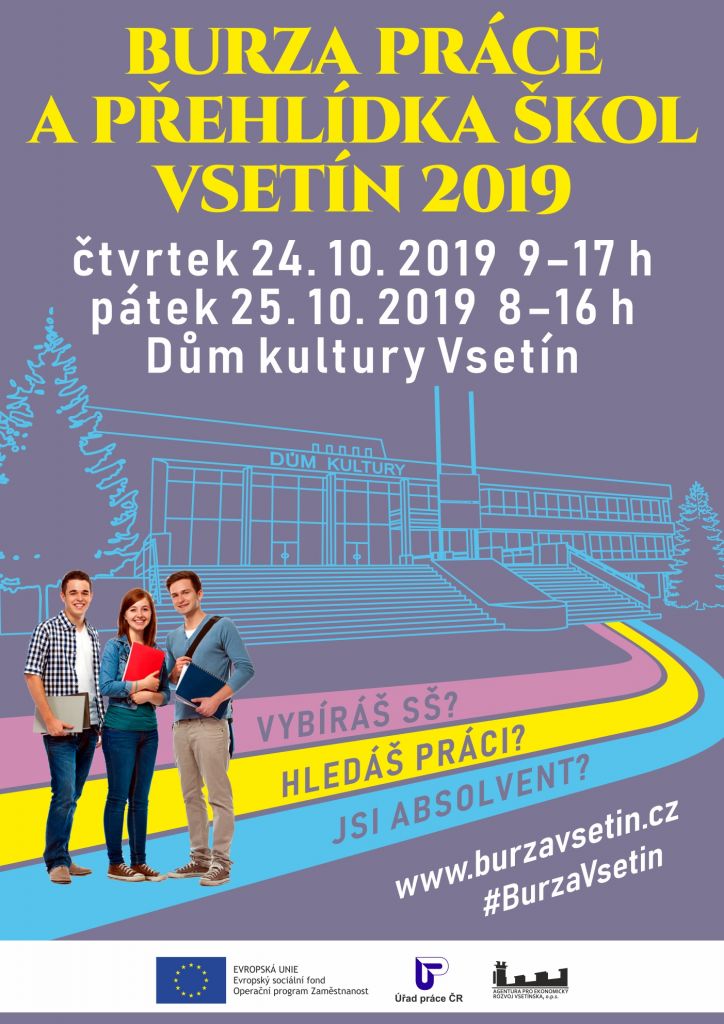 Úřad práce Vsetín ve spolupráci s ostatními subjetky Vás zvou na burzu práce a přehlídku škol. Akce se koná 24. 10. 2019 a 25. 10. 2019 v Domě kultury Vsetín.