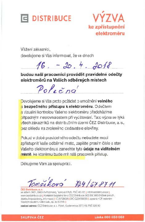 Společnost ČEZ Distribuce, a.s. upozorňuje, že ve dnech 16.4. - 20.4.2018 budou jejich pracovníci provádět pravidelné odečty elektroměrů. Společnost žádá všechny občany o umožnění volného a bezpečného přístupu k elektroměru. Za spolupráci předem děkujeme.