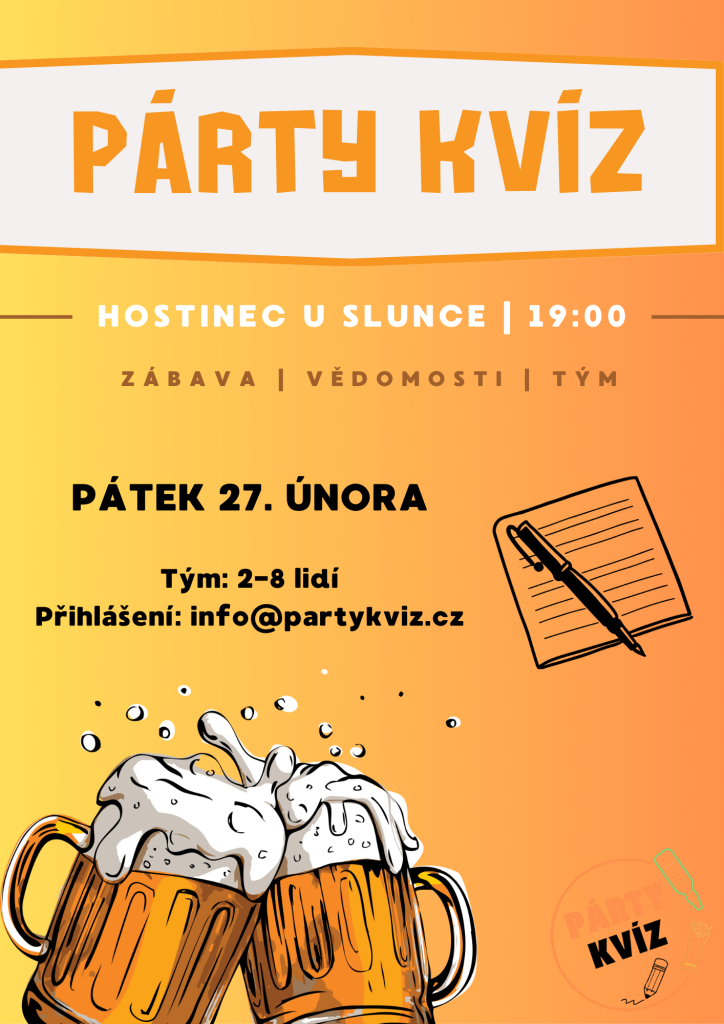Oblíbený párty kvíz má svůj termín i v měsíci únoru. A to 27. února 2026 v 19:00 U Slunce.
