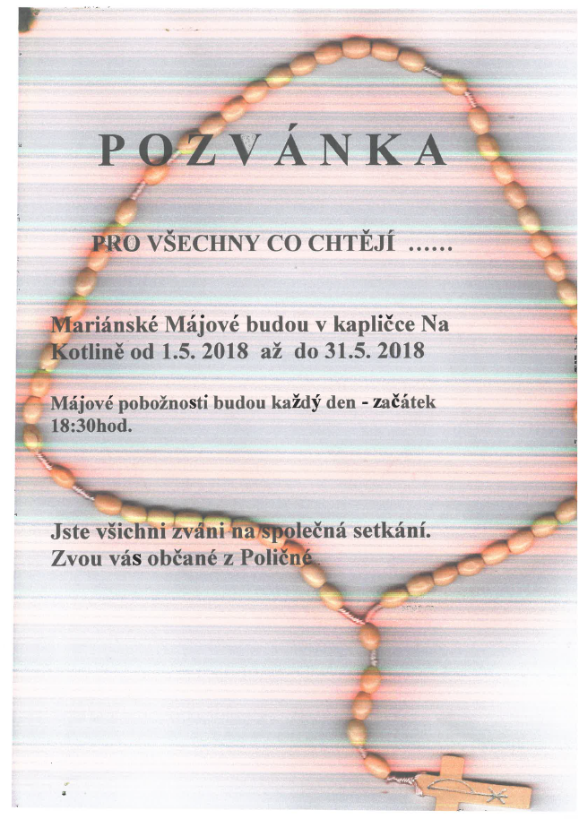 Ve dnech od 1.5.2018 do 31.5.2018 budou každý den od 18.30 hod. probíhat v kapličce Na Kotlině Májové pobožnosti.