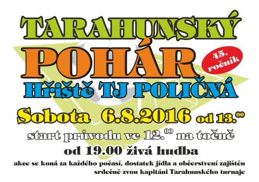Zveme všechny spoluobčany na každoroční Tarahunský pohár, který se bude konat v sobotu 6. 8.2016. Start průvodu bude ve 12:00hod. na točně. Od 13:00hod. bude akce pokračovat na hřišti TJ Poličná.