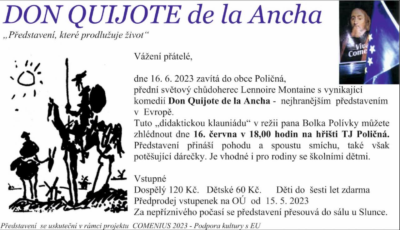 Přijďte se pobavit komedií v režii Bolka Polívky - Don Quijote de la Ancha. Představení se uskuteční tentokrát v areálu hřiště TJ Poličná, a to 16. června 2023 od 18 hodin.