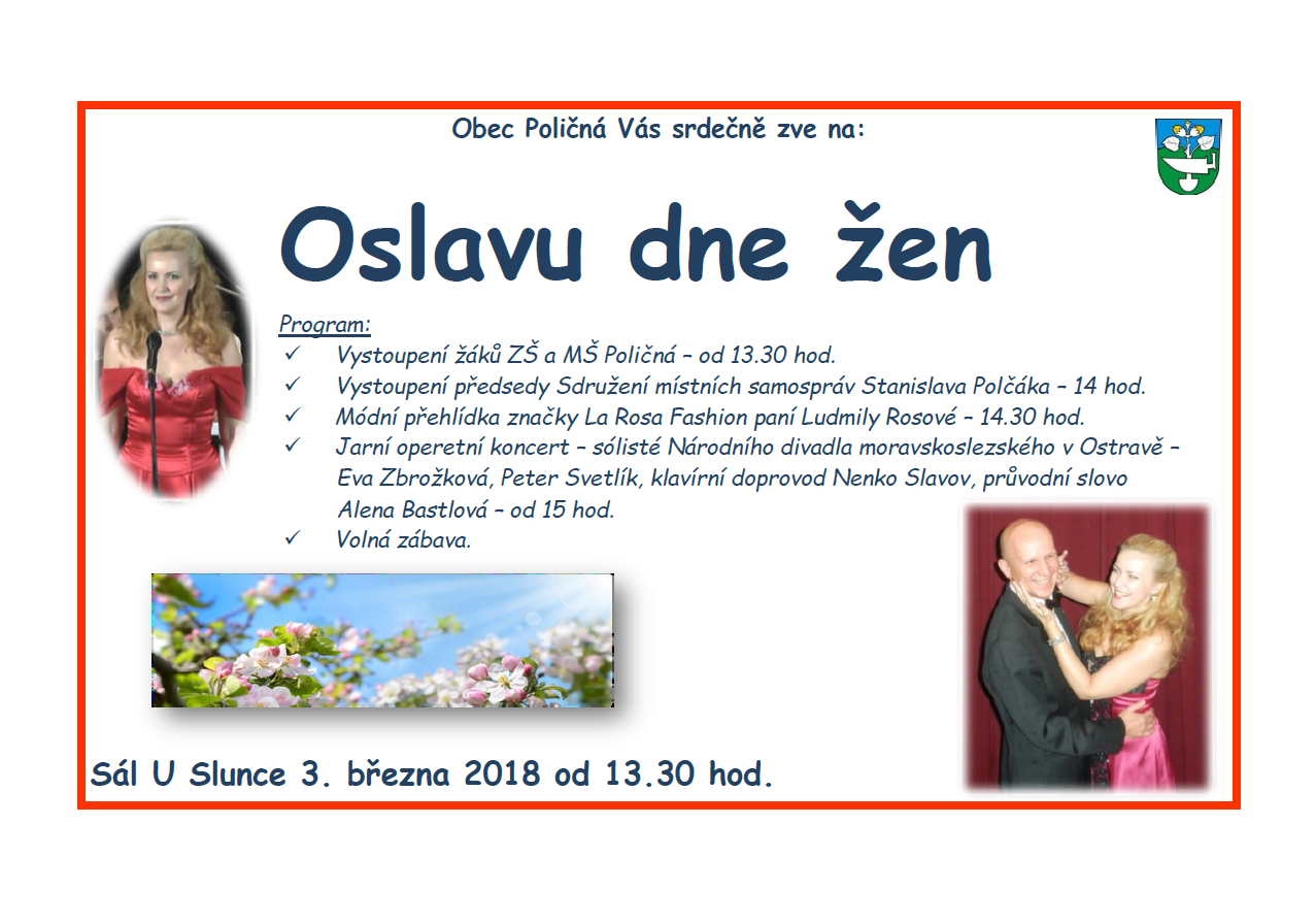 Vážení spoluobčané, Obec Poličná si Vás dovoluje pozvat na Oslavu dne žen, která se uskuteční 3. března 2018, od 13:30hod. v sále hostince U Slunce.