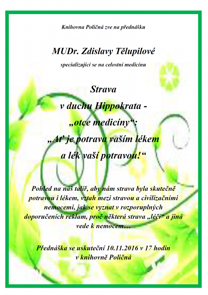 Knihovna Poličná zve na přednášku MUDr. Zdislavy Tělupilové, specializující se na celostní medicínu. Přednáška se bude konat ve čtvrtek 10.11.2016 v 17:00hod., v knihovně Poličná.