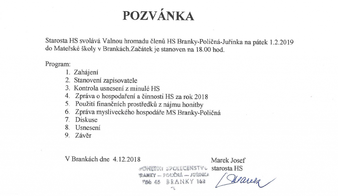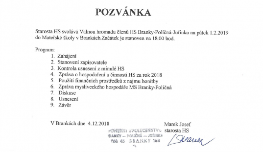 Starosta HS Branky - Poličná - Juřinka svolává na pátek 1.2.2019 Valnou hromadu členů Honebního společenství. Začátek je v 18:00hod. a místem konání je Mateřská škola v Brankách.