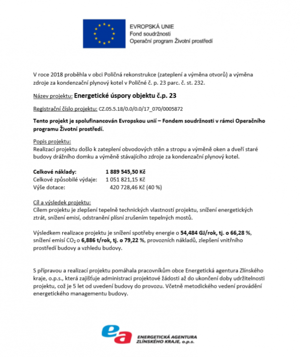 V příloze naleznete publicitu projektu Energetické úspory objektu č.p. 23, který byl spolufinancován Evropskou unií - Fondem soudržnosti v rámci Operačního programu Životního prostředí.