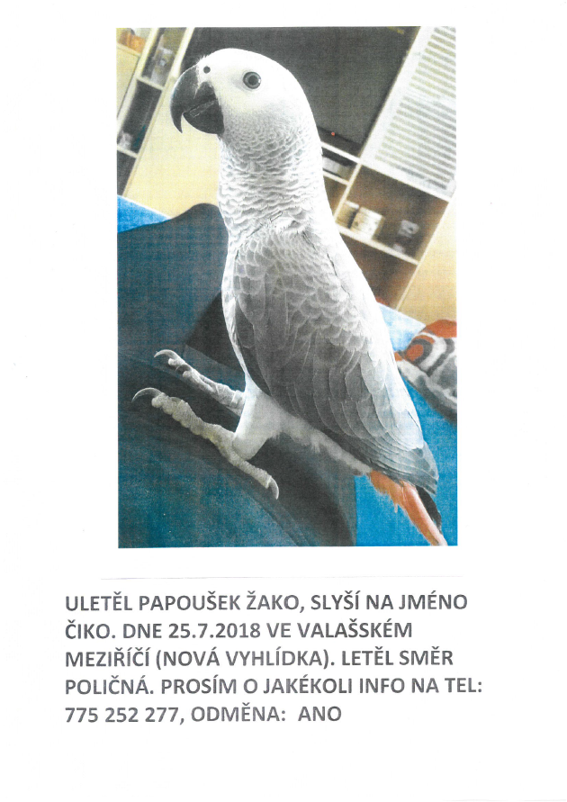 Dne 25.7.2018 uletěl papoušek Žako, slyšící na jméno Čiko. Jakékoliv informace o papouškovi volejte na telefonní číslo 775 252 277.